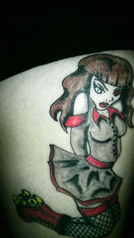 Yes I know 4 tattoos really isn't a lot but it has taken me 16 years to get them all. The first is a profile of a horse with a rose in its mouth (1995), next is an arm band with flowers.....when barbed wire&tribal was popular (2002), then a paint horse with monarch butterfly wings (2005) and finally my roller derby girl (2011).